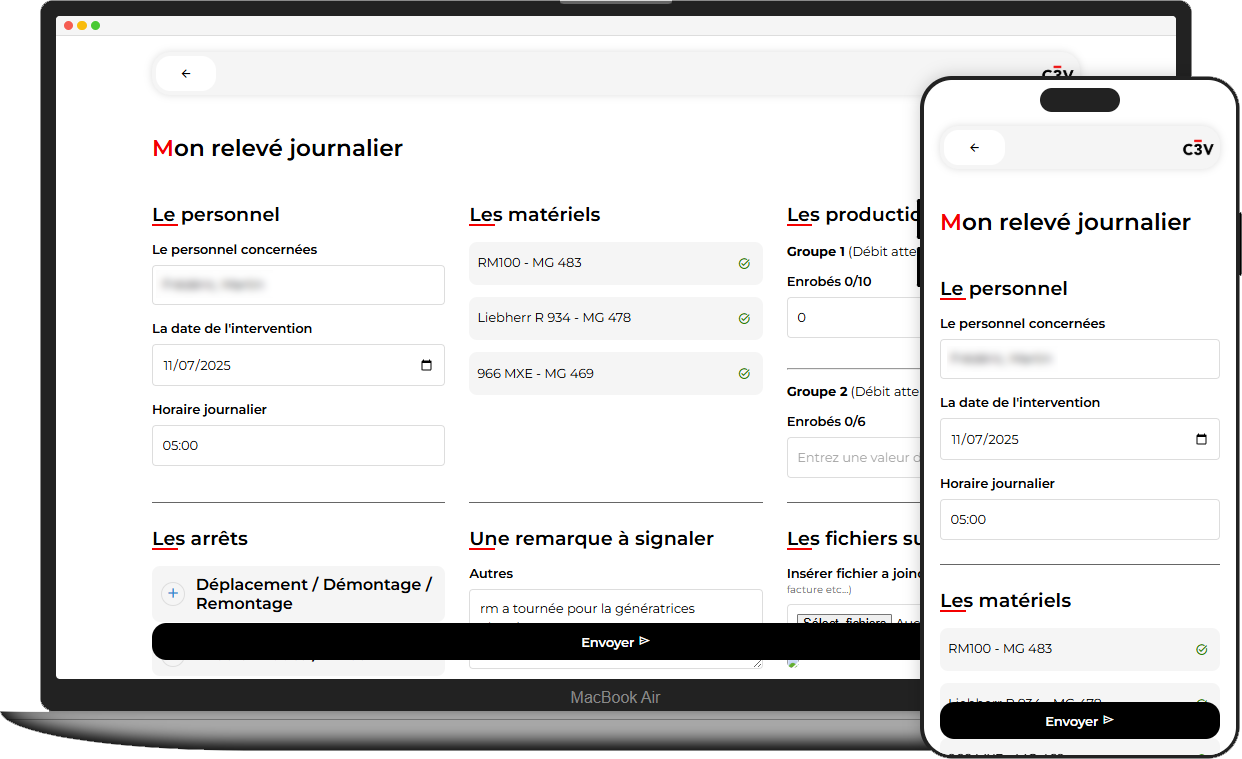 Outil interne pour le suivi des heures, des matériaux, des productions et des validations terrain.