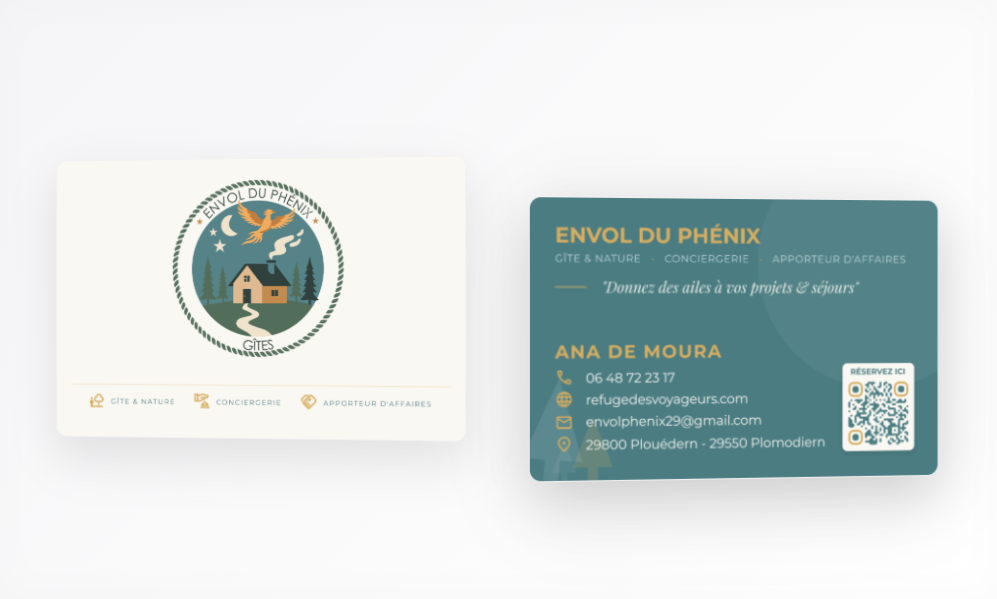 Création de cartes de visite élégantes et professionnelles, déclinées selon l’identité visuelle du gîte.
